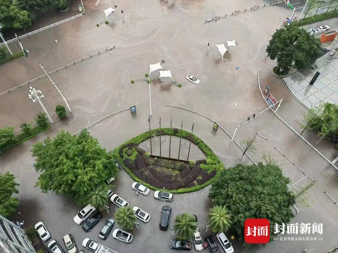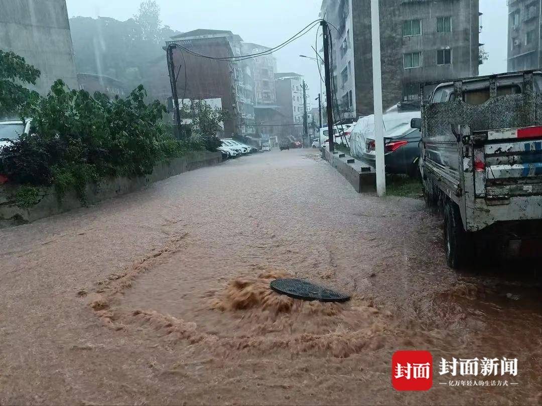 中午12点半左右,暴雨致中心城区多个路口出现积水,不少小轿车涉水“闯关”想通过路口,不料路口的积水太深被迫“停摆”。封面新闻记者实地走访发现,当天中午时分,达州南城区、西城区部分街道的路面积水达到50厘米以上,个别低洼地带的下水道井盖被冲破。与此同时,达州市市政工程管理处也派出20余名抢险人员,蹲守在低洼地带排险。