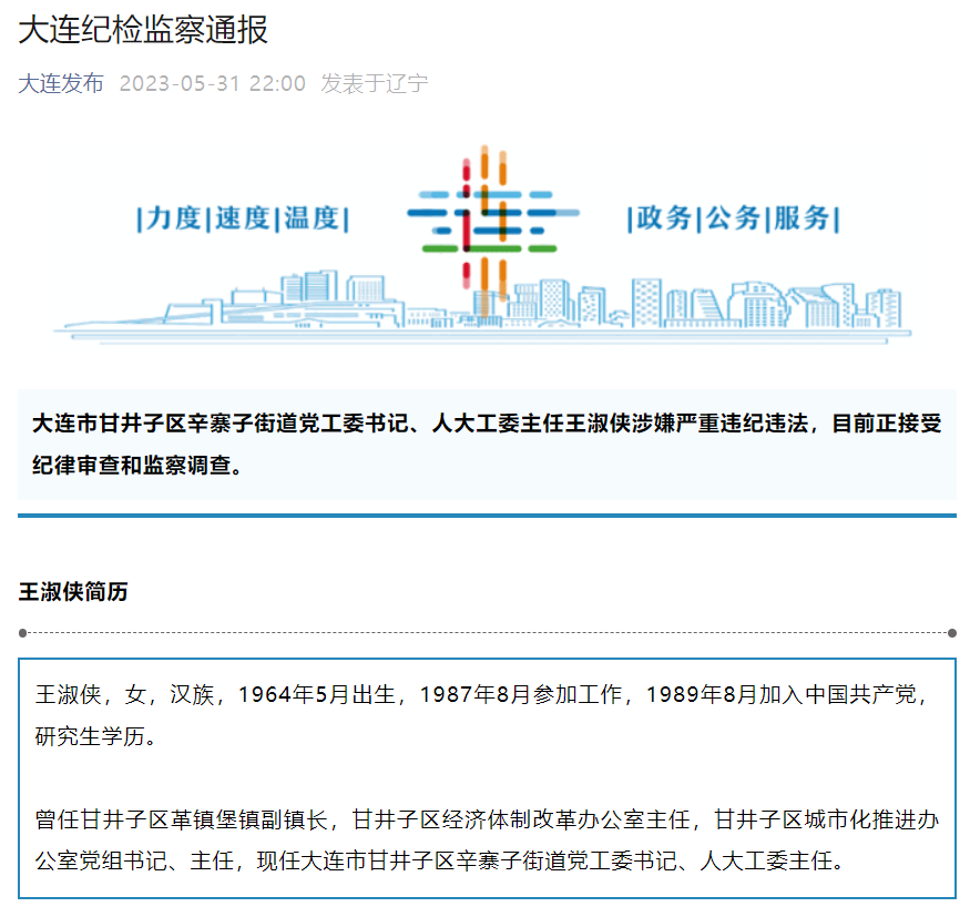 5月31日,据大连发布:大连市甘井子区辛寨子街道党工委书记、人大工委主任王淑侠涉嫌严重违纪违法,目前正接受纪律审查和监察调查。
