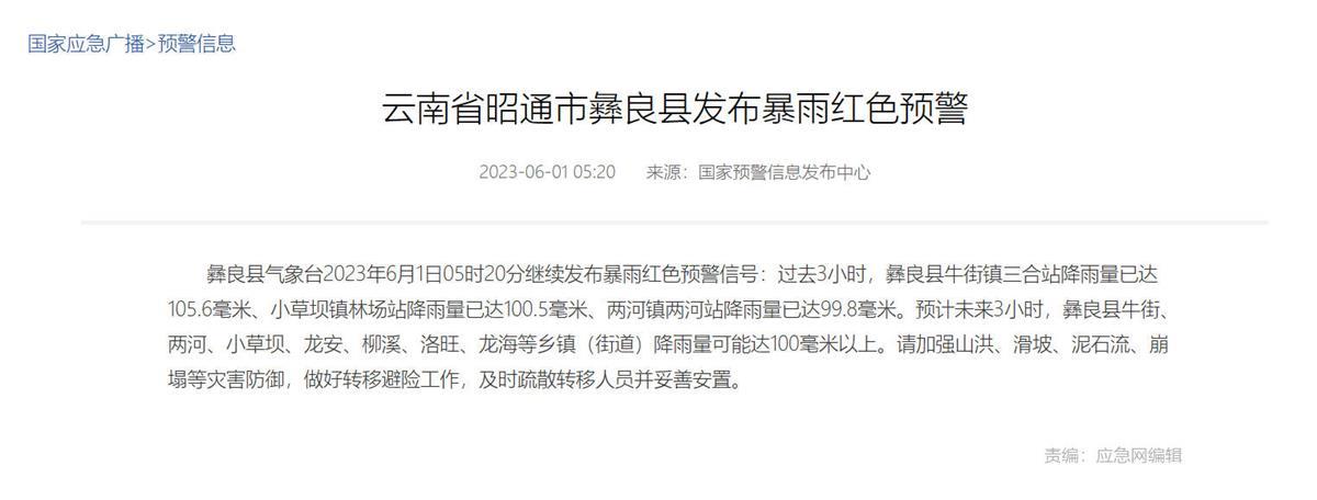 6月1日5时20分,彝良县气象台发布暴雨红色预警信号:过去3小时,彝良县牛街镇三合站降雨量已达105.6毫米、小草坝镇林场站降雨量已达100.5毫米、两河镇两河站降雨量已达99.8毫米。预计未来3小时,彝良县牛街、两河、小草坝、龙安、柳溪、洛旺、龙海等乡镇(街道)降雨量可能达100毫米以上。请加强山洪、滑坡、泥石流、崩塌等灾害防御,做好转移避险工作,及时疏散转移人员并妥善安置。