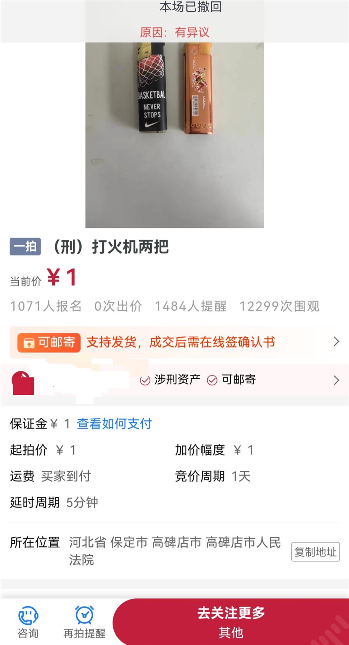 5月26日,高碑店市人民法院发布竞买公告,拍卖两个一次性打火机,竞拍从6月12日10时至6月13日10时进行。两个火机有使用痕迹,标记为涉刑资产,可邮寄。截至6月2日,这场名为“(刑)打火机两把”的拍卖引起上万次围观,更有1071人报名,不过目前该起拍卖已经撤销。