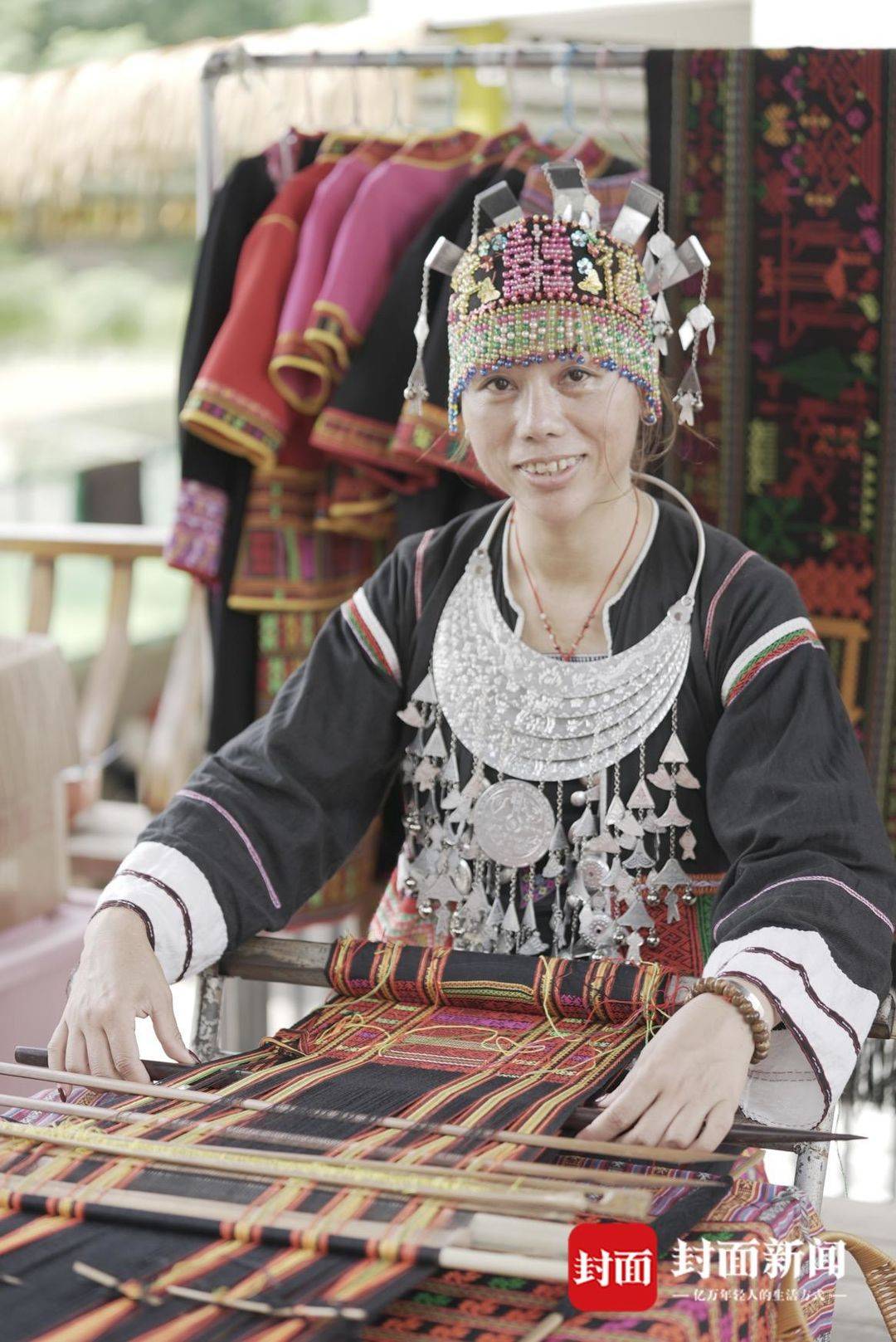 海南热带雨林国家公园内,村民王叶侦售卖手工制作的黎锦服装。