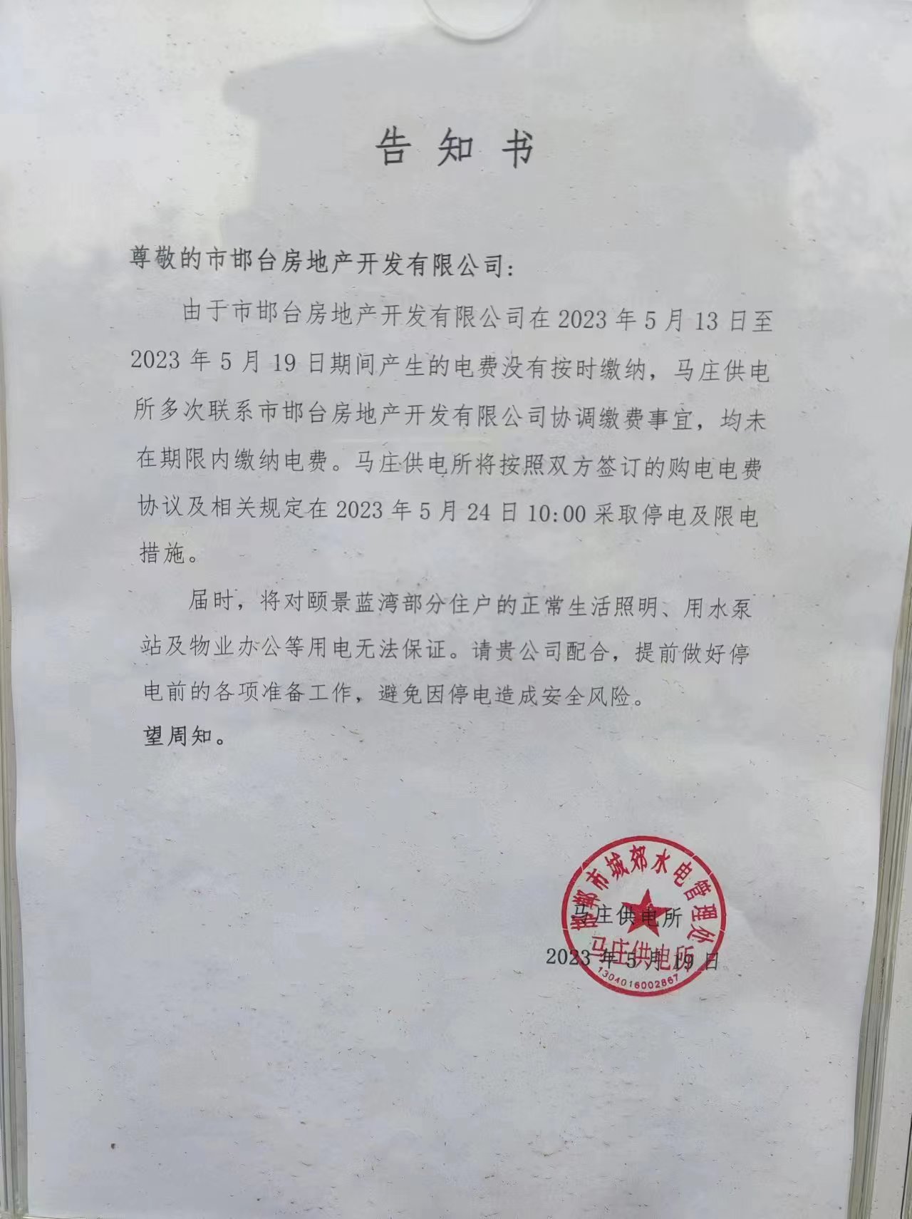 然而,5月19日,邯郸市城郊水电管理处马庄供电所发给邯郸市邯台房地产开发有限公司的告知书称,因后者在2023年5月13日至2023年5月19日产生的电费没有按时缴纳,供电所多次联系后者协调缴费事宜,均未在期限内缴纳电费。供电所将按照双方签订的购电电费协议及相关规定在2023年5月24日10:00采取停电及限电措施。