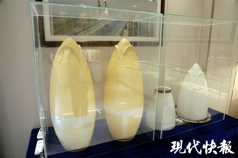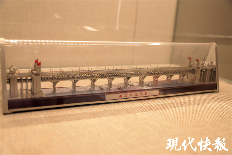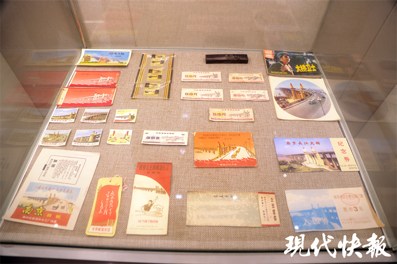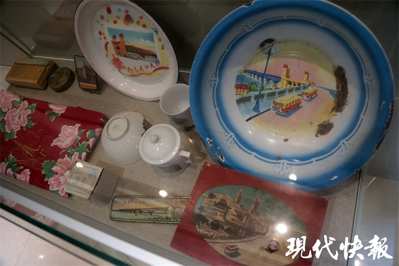 活动开始前,南京会场嘉宾们参观了南京长江大桥桥史馆。这座距离大桥不远的小馆里,收藏了许多满载“大桥记忆”的实物,除了大桥建设中用到的瓷砖、混凝土实验块、玉兰花灯罩,以及木工刨刀、千分尺等生产工具,最能勾起一代人“回忆杀”的就是年代感满满的“大桥IP系列文创”。