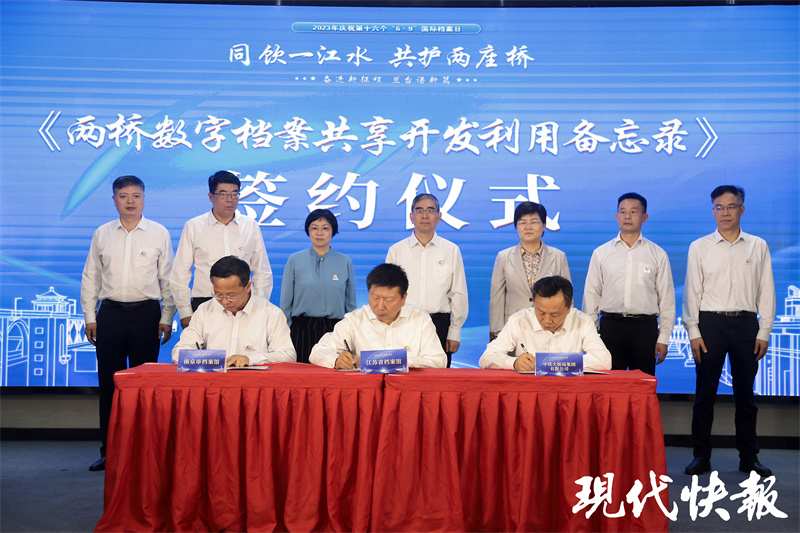 江苏省档案馆、湖北省档案馆、南京市档案馆、武汉市档案馆和中铁大桥局正式签署了馆藏两桥数字档案开发利用备忘录,将更好地利用两座长江大桥的档案。