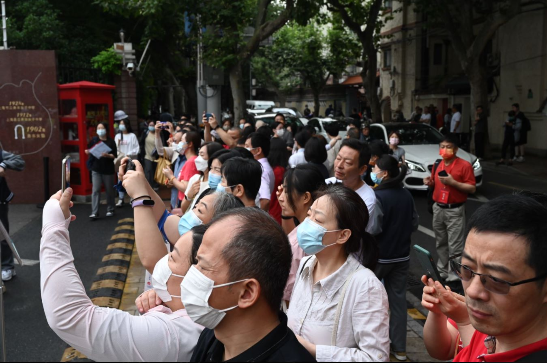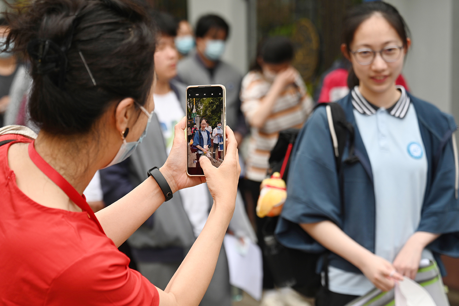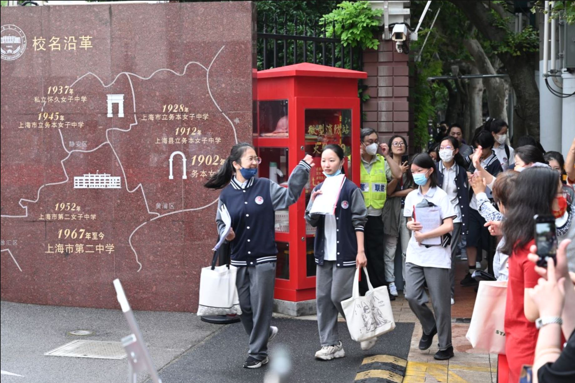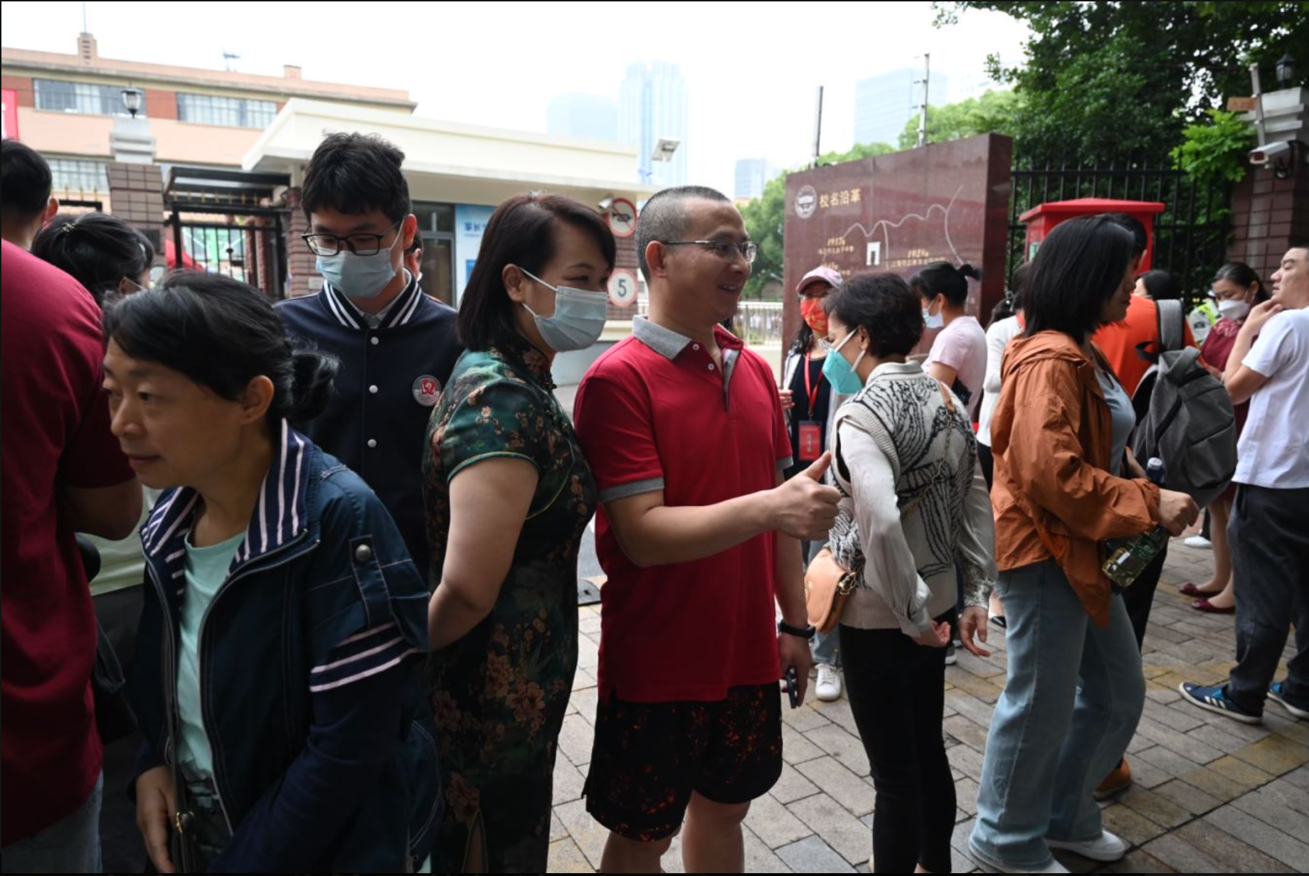 2023年6月7日,上海市第二中学,送考的家长,妈妈穿着旗袍寓意“旗开得胜”,爸爸穿红衫,为考生送祝福。澎湃新闻记者吴栋图