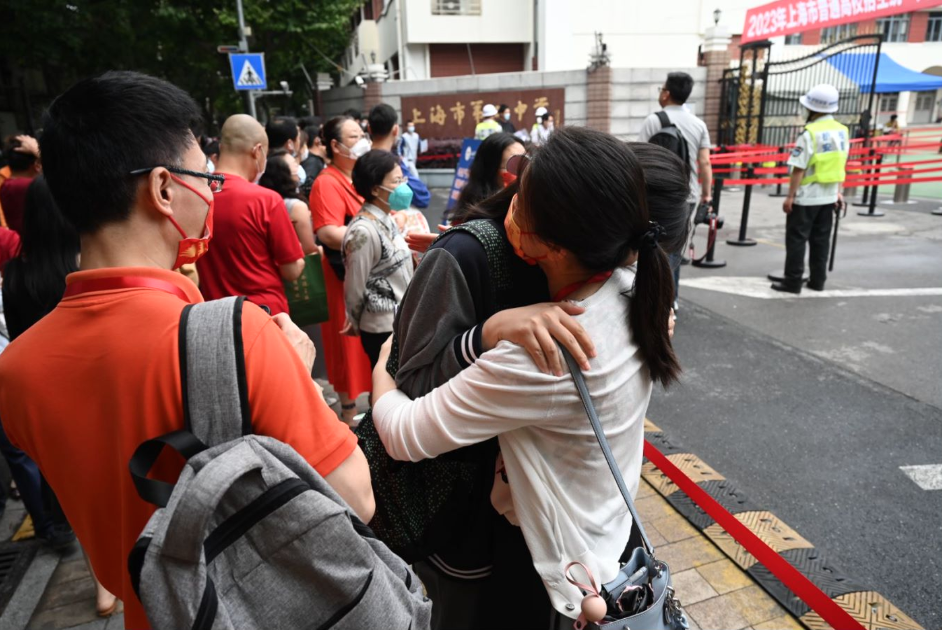 2023年6月7日,上海,华东理工大学附属中学考点,送考老师和学生拥抱。澎湃新闻记者朱伟辉图