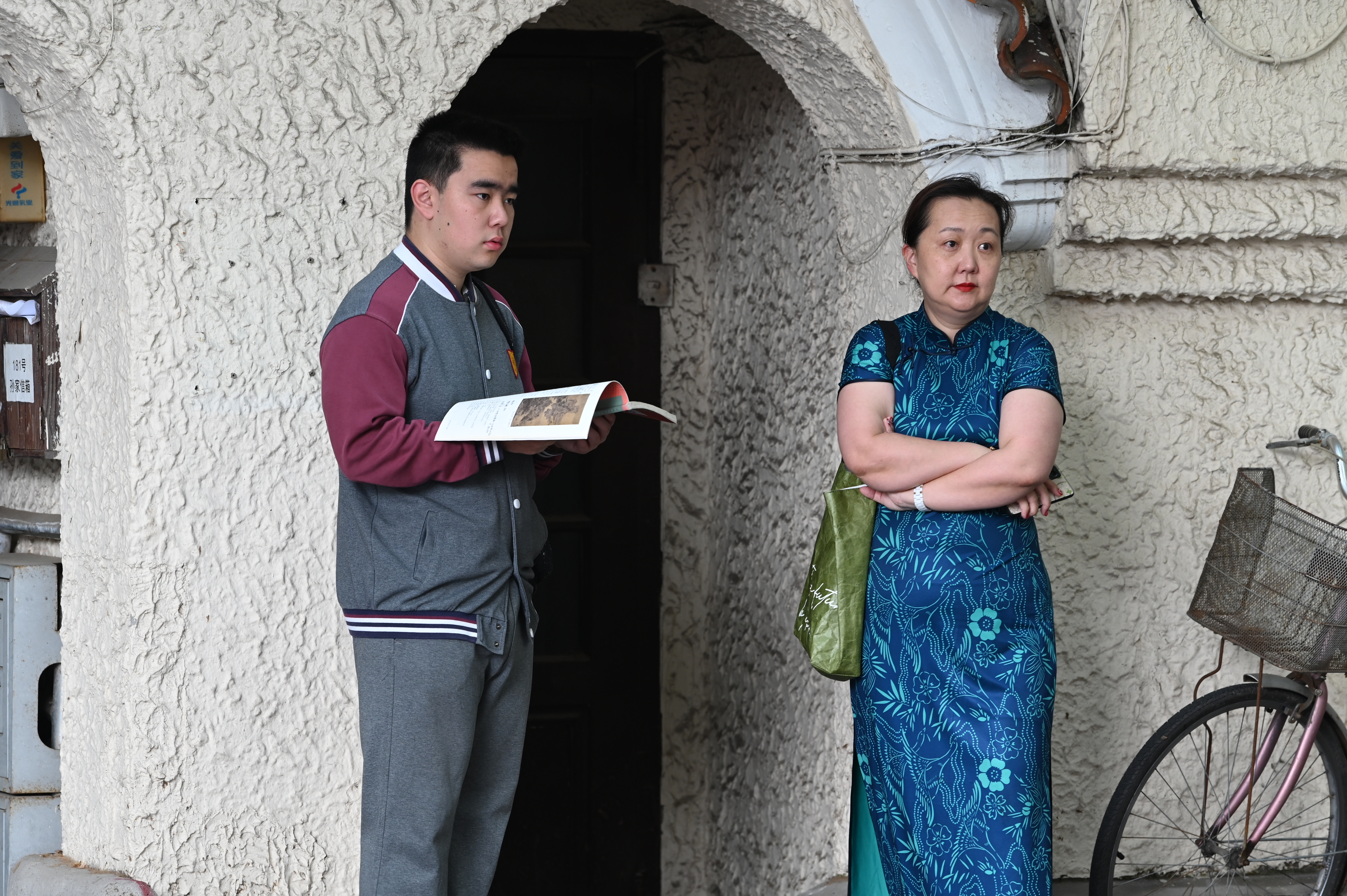 2023年6月7日,上海市第二中学,送考的家长穿着旗袍,寓意“旗开得胜”,旁边的考生正在抓紧时间复习。澎湃新闻记者吴栋图