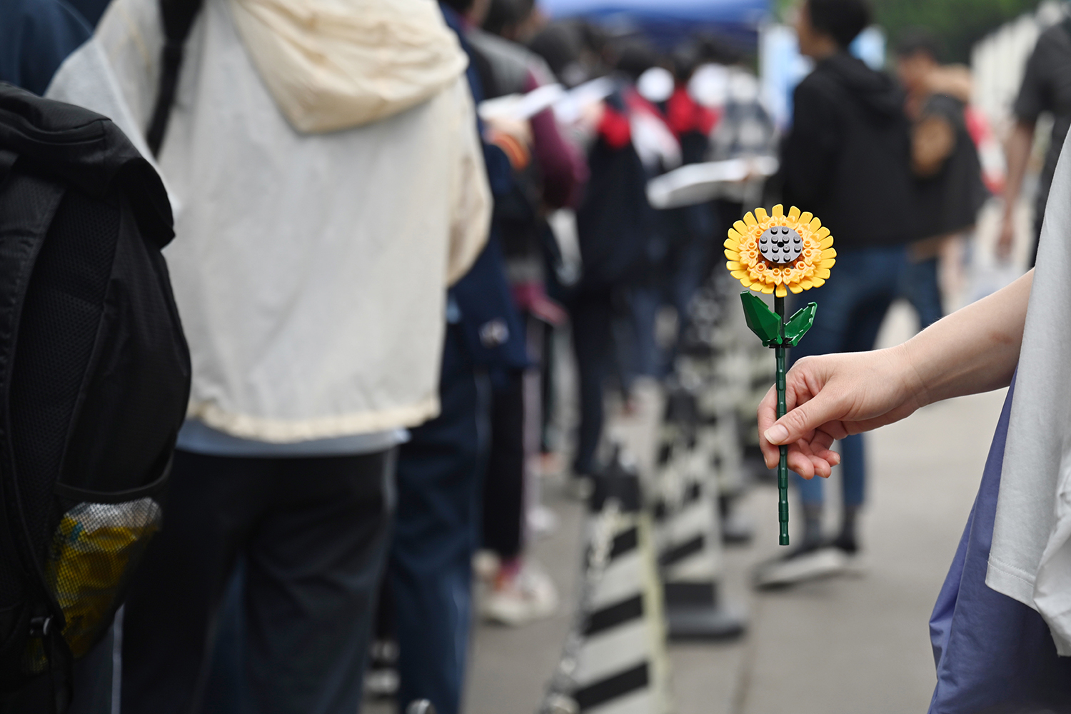 2023年6月7日,上海,华东理工大学附属中学考点,一位家长拿着“向日葵”。澎湃新闻记者朱伟辉图
