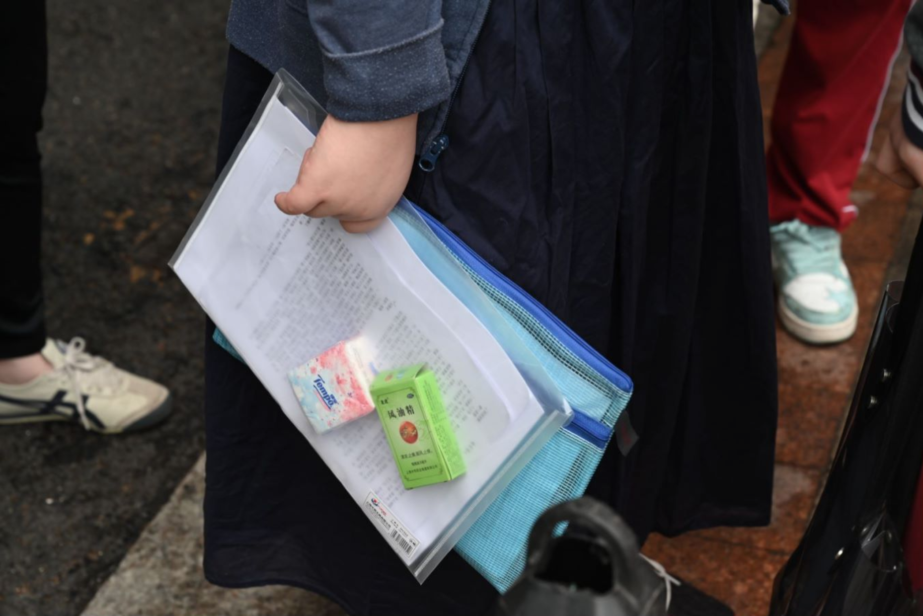 2023年6月7日,上海市第二中学,考生将携带进考场的透明袋,除了文件外,还有一包纸巾和一瓶风油精。澎湃新闻记者吴栋图