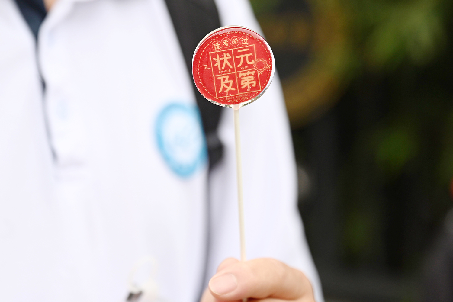 2023年6月7日,上海,华东理工大学附属中学考点,考生拿着老师送的棒棒糖。澎湃新闻记者朱伟辉图