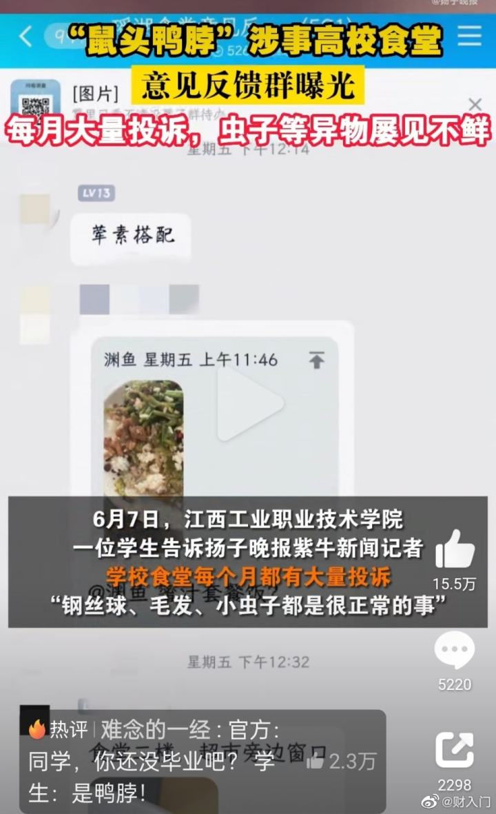 此前6月1日,一段“食堂吃出疑似老鼠头”的视频在社交平台出现并广泛传播。在视频画面中的饭菜内,可以看到体积较大的黑色异物,异物还有类似动物“牙齿”的东西。