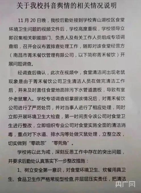 2021年,南昌市市场监督管理局就曝光该校有老鼠问题的情况说明(视频截图)