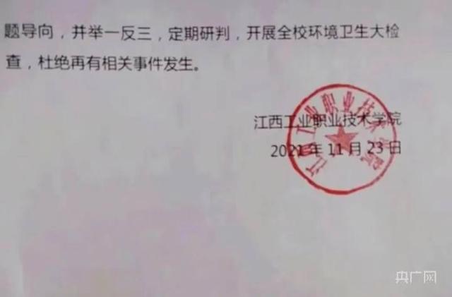情况通报还提到,南昌市高新区市场监督管理局接到情况报告后,第一时间派出执法人员到江西工业职业技术学院开展调查,问询学校工作人员、食堂负责人、当事学生及相关知情人,对食品留样进行采样检测。