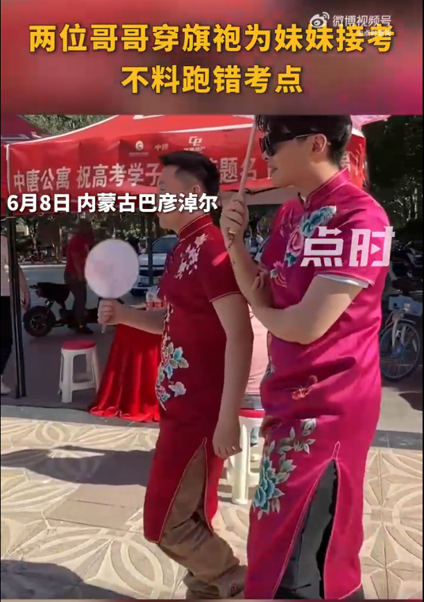 6月8日,内蒙古巴彦淖尔,两名哥哥穿旗袍顶着烈日去为妹妹接考,随后发现跑错了考点,最终成功见到妹妹后被瞬间逗笑,秒变社死现场。视频中,两人各自撑伞摇扇,还不时向路人挥手,有网友调侃:哥哥打伞的姿态绝了!