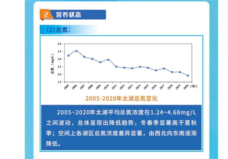 现代快报讯(记者 是钟寅)一曲《太湖美》传唱至今,歌词中“美就美在太湖水”让人难忘。数十年来,太湖水质牵挂人心。6月9日,中科院南京地理与湖泊研究所发布《中国湖泊生态环境研究报告--太湖》,报告显示,太湖流域生态环境改善,总氮浓度下降明显,生物多样性有所提高。