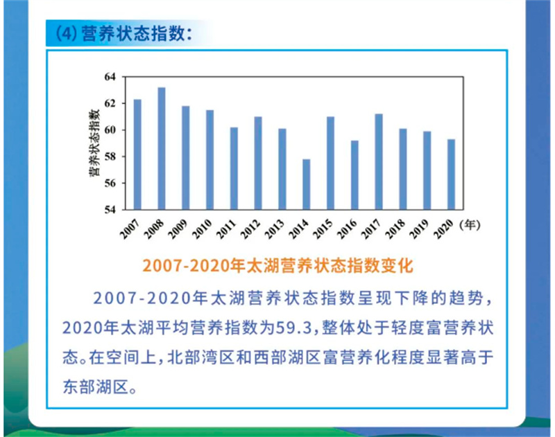 2007-2020年太湖营养状态指数呈现下降的趋势,2020年太湖平均营养指数为59.3,整体处于轻度富营养状态。在空间上,太湖北部湾区和西部湖区富营养化程度显著高于东部湖区。由于太湖属于大型浅水湖泊,富营养化治理仍是艰巨任务。由于入湖河道多,流域人类活动强烈,使得外源污染控制的管理成本和技术成本都很高。