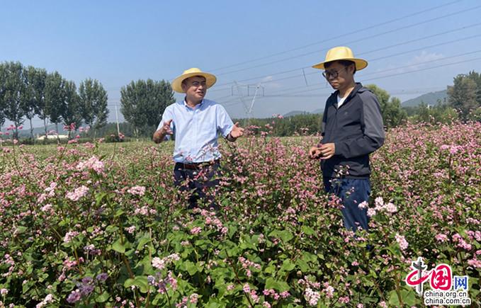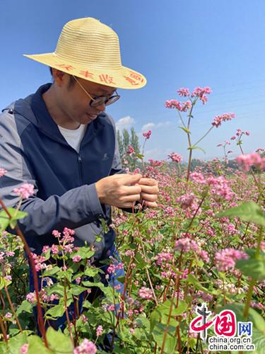 今年37岁的中国农业科学院作物科学研究所研究员、博士生导师周美亮博士正在查看荞麦生长情况,“在平谷区农业农村局的支持下,我们从今年年初开始创建荞麦分子育种‘博士’农场,今年上半年在5个不同点种了20亩,下半年又种了50亩荞麦育种基地,收集了220余份材料,筛选出适合低海拔种植的红花荞麦新品系。红花荞麦花期长达一个半月,非常适合平谷地区乡村旅游开发,我们将重点针对这个材料进行扩繁和展示,发展荞麦产业,助力平谷乡村振兴。”