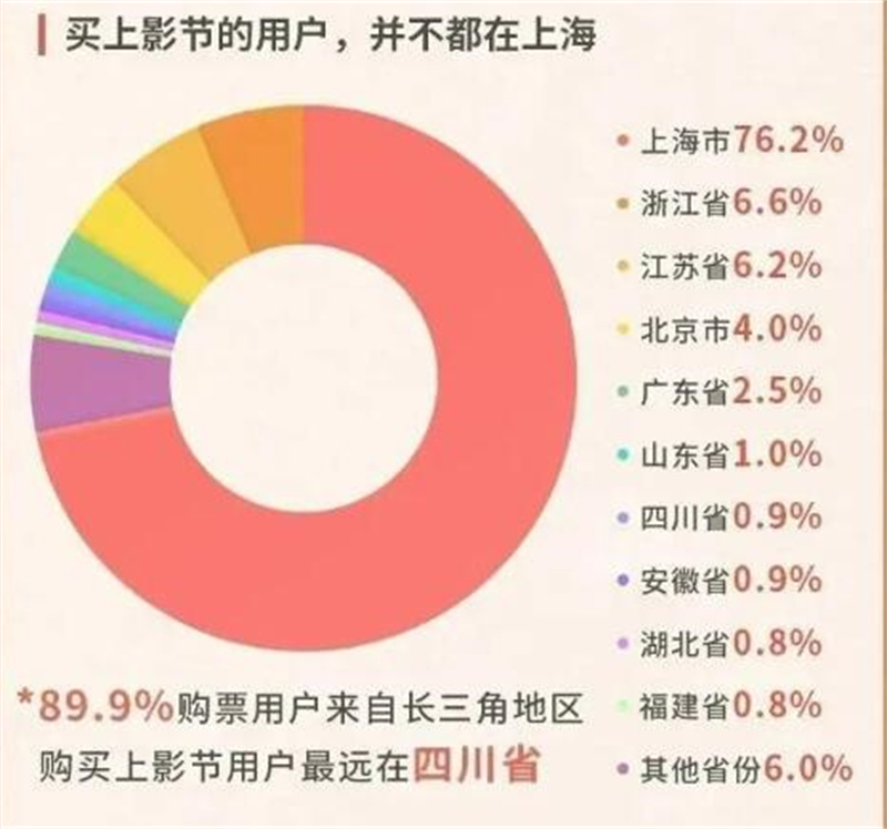值得一提的是,参与抢票的,并不只有来自上海的影迷。官方数据显示,开票首日,购票用户中76.2%来自上海,另外6.6%来自浙江、6.2%来自江苏,4%来自北京,最远的购票用户来自四川。