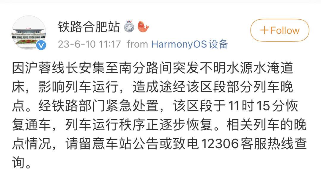 11时许,上海铁路局合肥火车站回应称,当天8时20分许,沪蓉线长安集至南分路间突发不明水源水淹道床,影响列车运行,造成途经该区段部分列车晚点。经铁路部门紧急处置,该区段于11时15分恢复通车,列车运行秩序正逐步恢复。