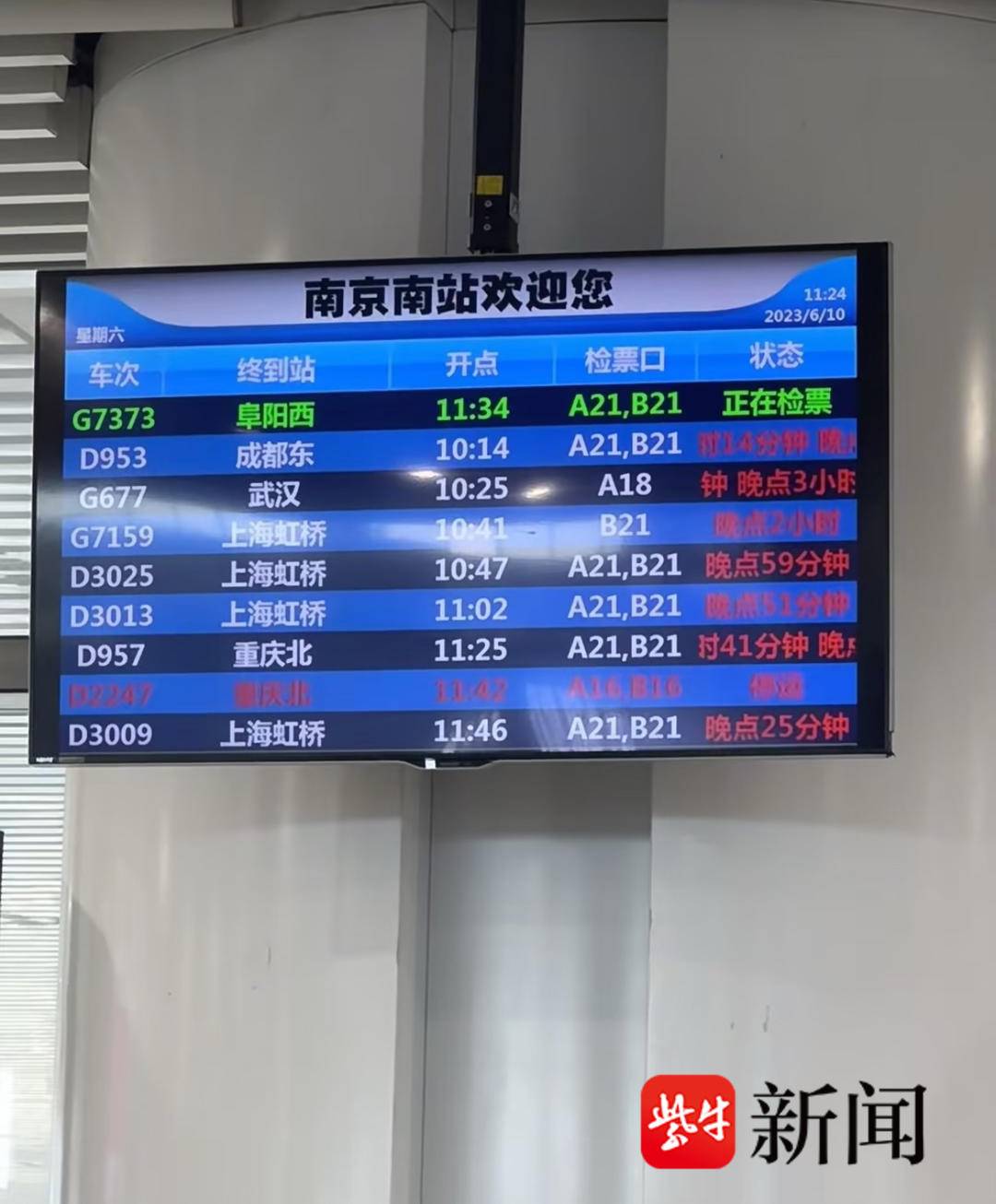 6月10日上午10时左右,南京南站的许多旅客反映,多趟高铁均出现晚点的状况,有的线路则直接停运。童先生告诉记者,自己原本在南京南站乘坐9时58分的列车前往合肥,结果延误了三个小时还未出发,最后改坐其他车次的列车。还有人表示,“南京南到合肥南,路上停停走走,一小时路程直接翻倍。”有旅客发现,所有经过合肥南站的线路都有延误停运的情况发生。