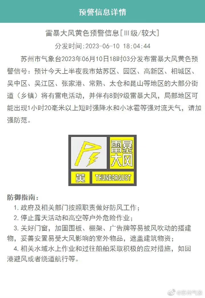 当天18点03分,苏州气象发布雷暴大风黄色预警信号,预计当天上半夜,苏州姑苏区、园区、高新区、相城区、吴中区、吴江区、张家港、常熟、太仓和昆山等地区的大部分街道(乡镇)将有雷电活动,并伴有8到9级雷暴大风。局部地区可能出现1小时20毫米以上短时强降水和小冰雹等强对流天气。市民出行需注意安全,加强防范。