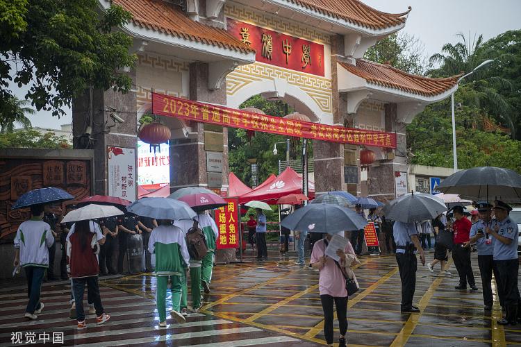2023年6月7日,海南省琼海市的考生在雨中赶考。