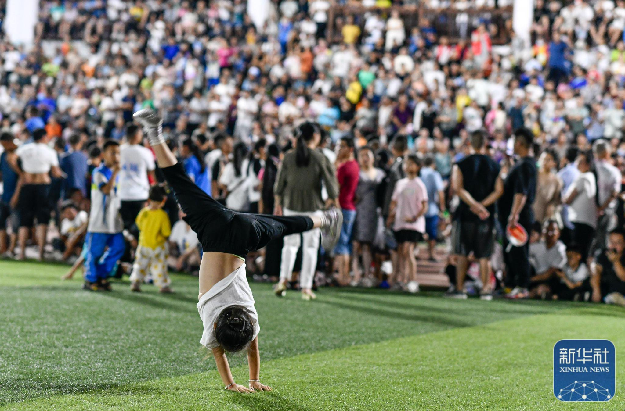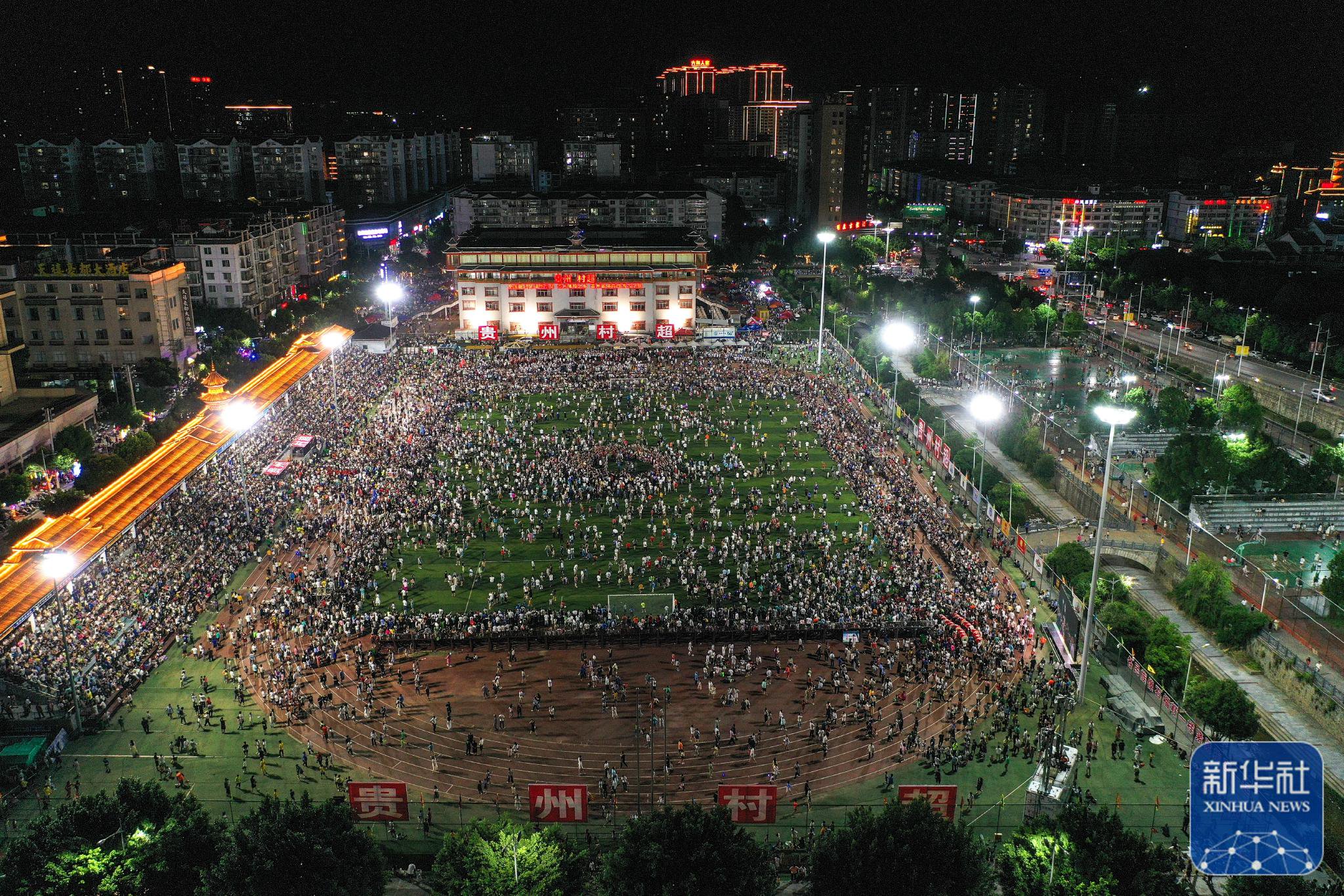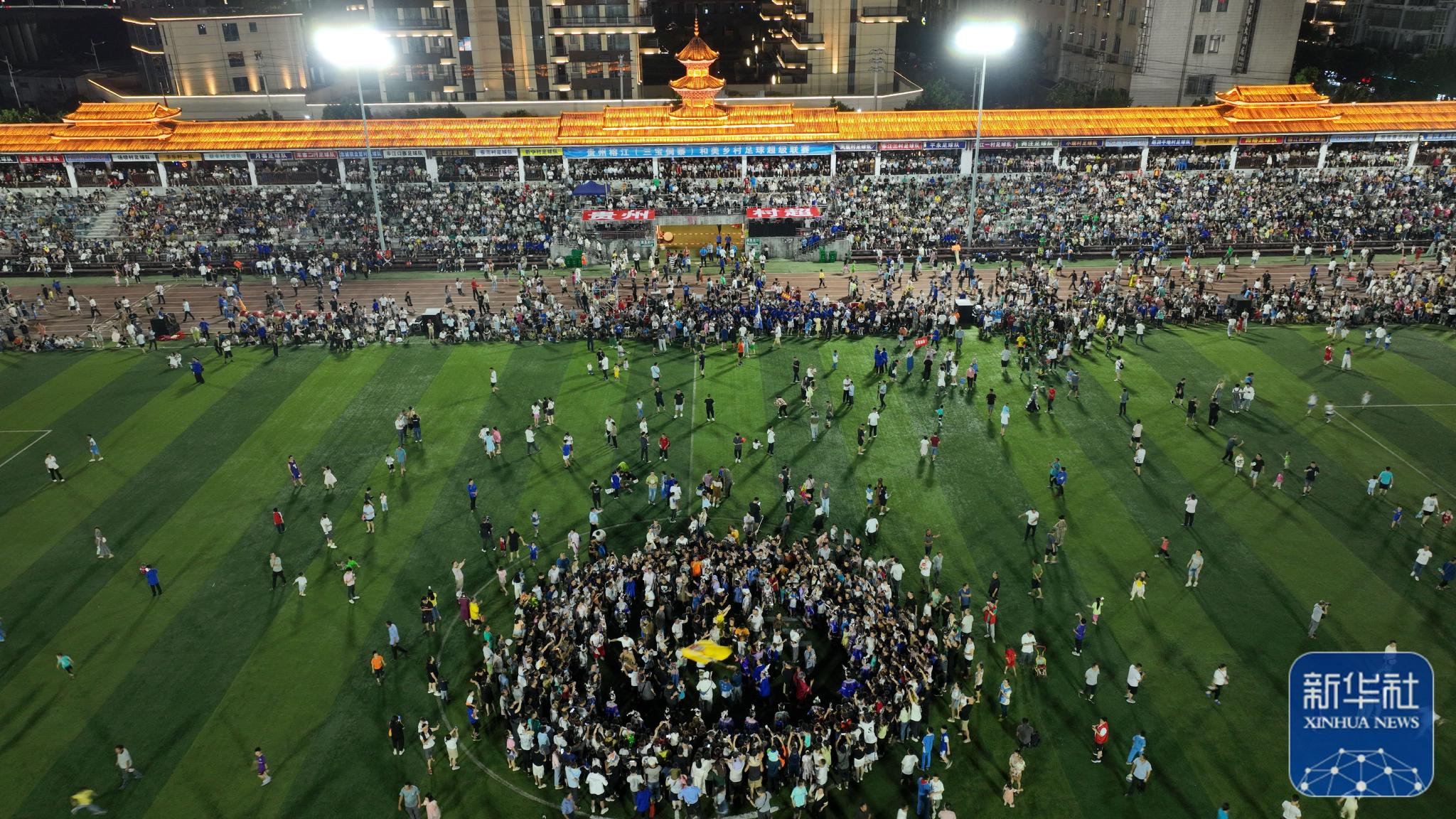 ↑6月10日,演员在贵州“村超”足球比赛后表演民族舞蹈“多耶”,现场观众一起上场狂欢(无人机照片)。新华社记者杨文斌摄