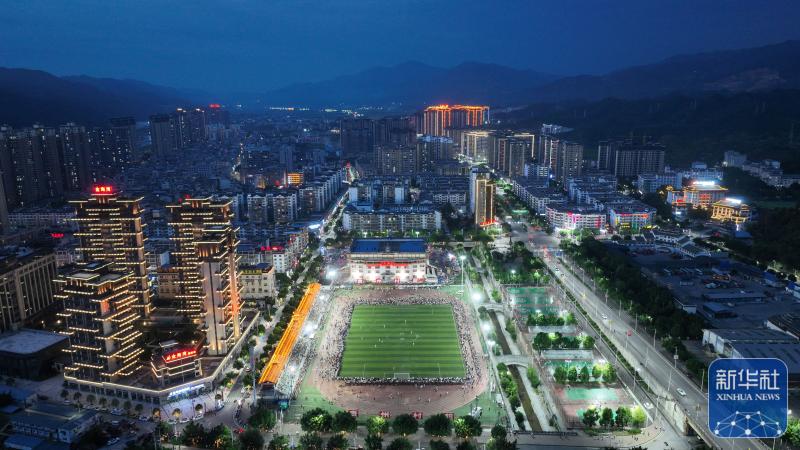 ↑6月9日拍摄的贵州“村超”足球比赛现场(无人机照片)。新华社记者刘勤兵摄明亮的灯光照亮夜空震天的呐喊此起彼伏