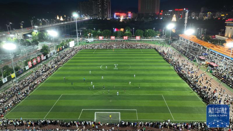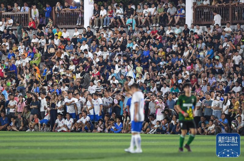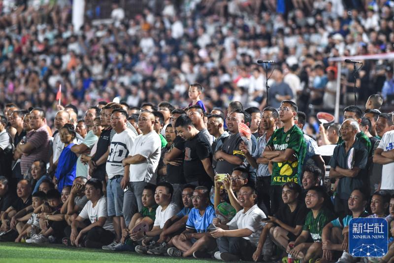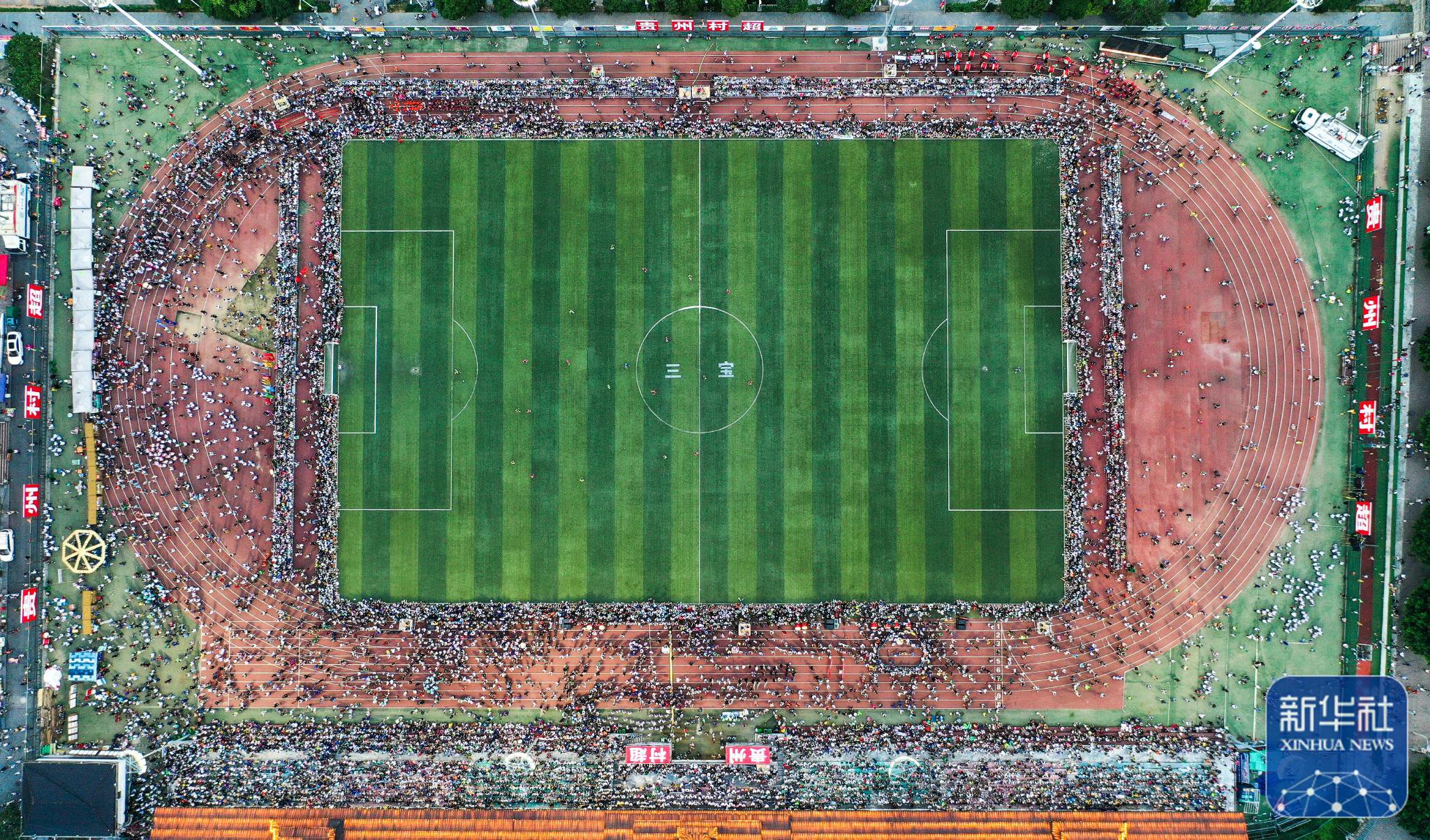 ↑6月9日,人们在观看月寨村队与丰乐村队的“村超”足球比赛。新华社记者杨文斌摄贵州“村超”即榕江(三宝侗寨)和美乡村足球超级联赛在榕江县城北新区田径足球场举行每周五、周六、周日比赛从傍晚持续到午夜