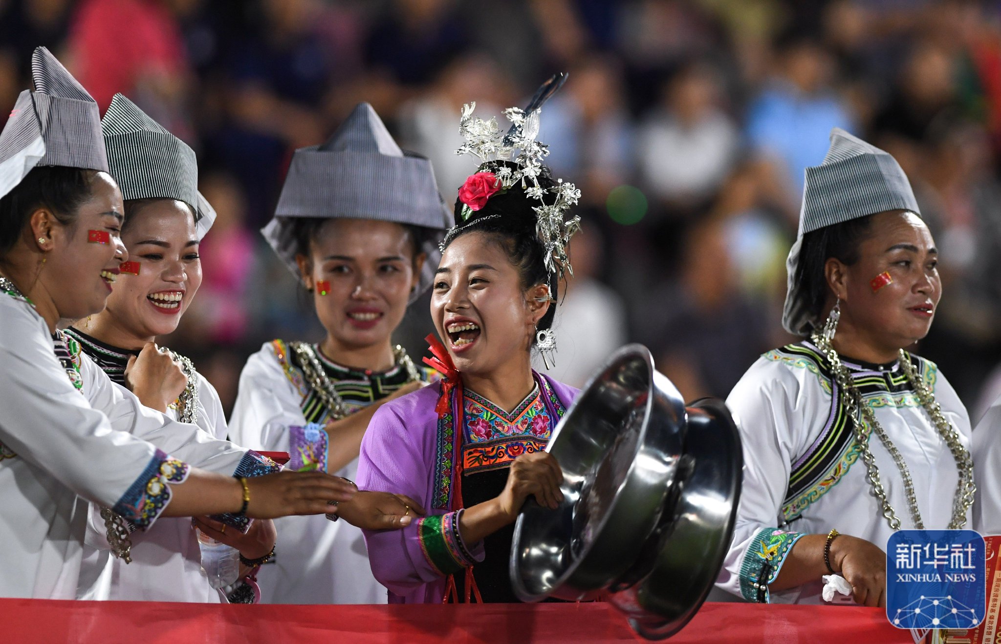 ↑6月9日,一名游客在贵州“村超”足球比赛现场与少数民族拉拉队合影。新华社记者杨文斌摄