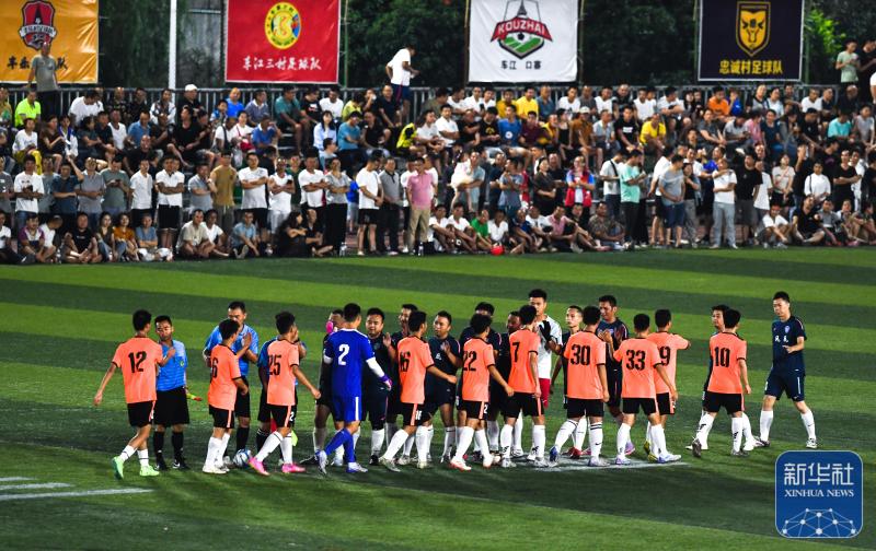 ↑6月9日,凤凰村足球队与新中村足球队在比赛结束后相互击掌致意。新华社记者杨文斌摄