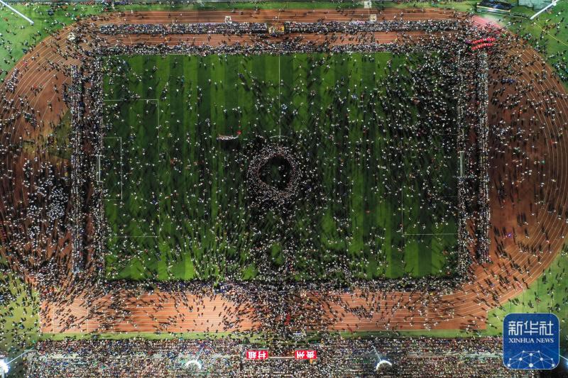 ↑6月9日拍摄的贵州“村超”足球比赛休息期间的民族舞蹈表演(无人机照片)。新华社记者刘勤兵摄