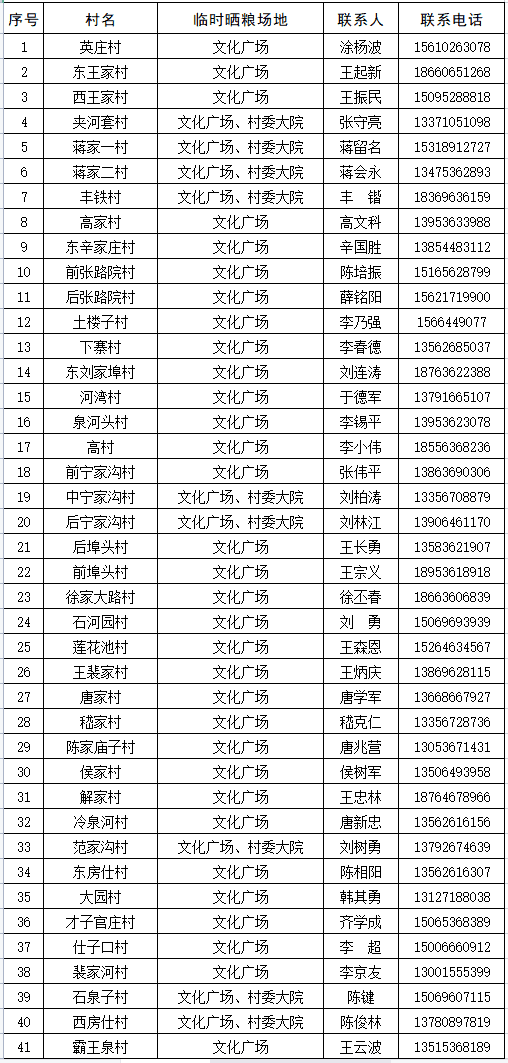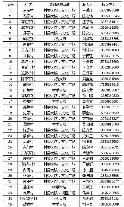 坊城街道所辖农村临时晒粮场地一览表