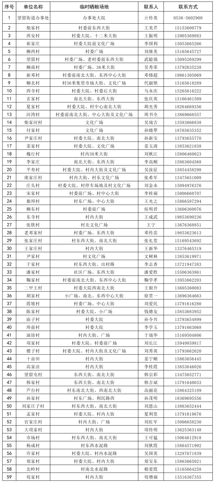望留街道临时晒粮场一览表