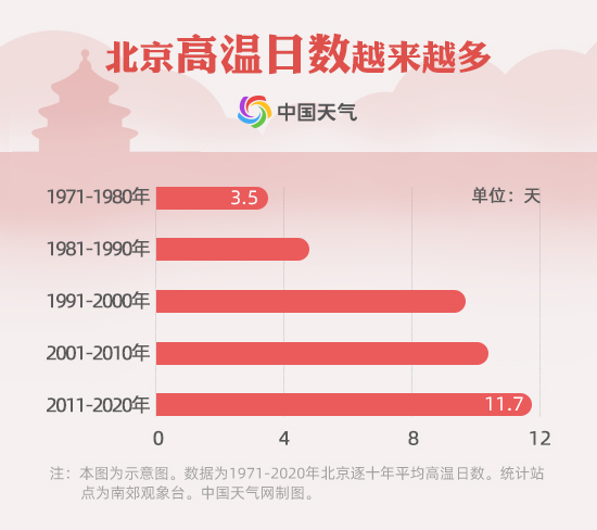除了首个高温日提前,北京高温日数的上升趋势也很明显。20世纪70年代,北京的年均高温日数为3.5天,到20世纪90年代升至9.7天,进入21世纪后,年均高温日数均超过10天,2011年至2020年的年均高温日数更是达到11.7天。北京还出现过高温日数超20天的情况,其中,2000年最多,达26天,1999年、2017年和2018年的高温日数也都超过了20天。