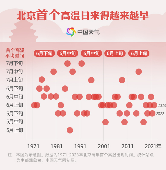 “近些年北京热得越来越早”,这并不只是主观感受。中国天气网统计近50年气象大数据发现,1971年至今,北京的第一个高温日出现时间呈现提前趋势。20世纪70年代,首个高温日通常出现在6月中下旬至7月;20世纪80年代至90年代,首个高温日的平均时间提前到6月中旬;进入21世纪,往往还没到6月中旬,气温就蹿至35℃以上。