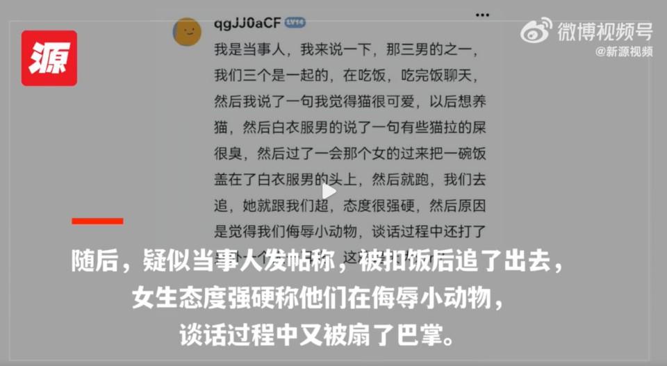另一段视频显示,女生从食堂狂奔而出,三名男生则在后面追她。