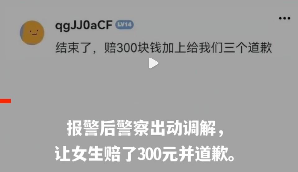 最终,报警后警察出动调解,让女生赔了300元并道歉。