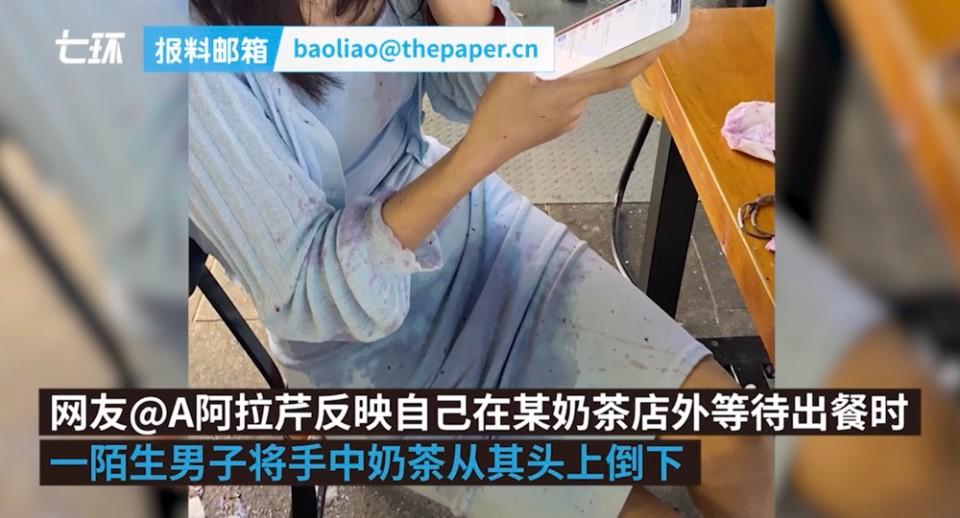 一名陌生男子直接把刚买的奶茶倒到自己头上随后离去。