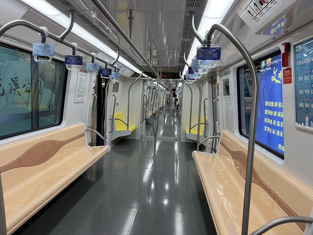 花桥站台内,有电子显示屏显示班车到站时间以及线路图,车厢车头车尾温度较高为弱冷,车厢中段为强冷。