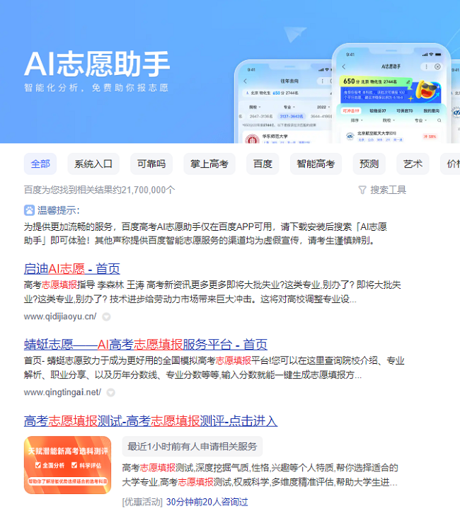 当记者在搜索系统里输入“AI志愿填报”后,数十款软件让人眼花缭乱,“权威可靠”“分分钟搞定”“稳准狠”等词语狠狠地刺激着记者的大脑,让记者为之冲动。
