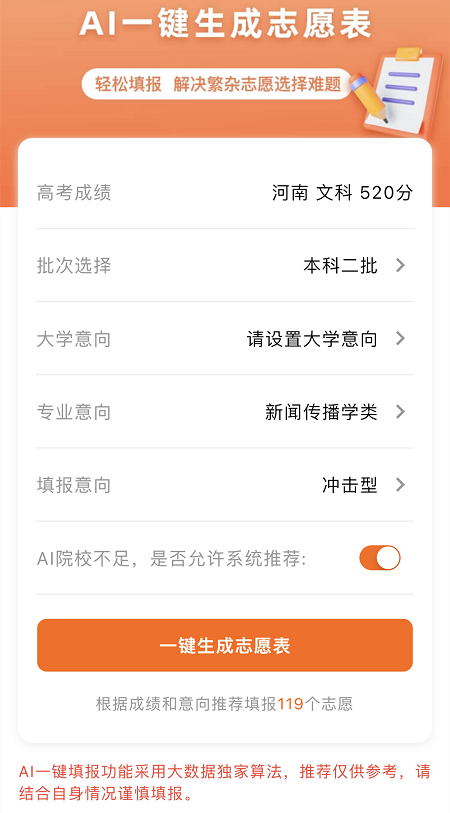 但如果你对复杂的表格、志愿的选择等问题头疼,那么你可能需要选择购买98元的志愿填报高级卡VIP。当然,也许有人会觉得如果能用同样的分数上更好的大学,这又算得了什么呢?需要注意的是,在选择购买的页面上往往会出现“AI一键填报功能采用大数据独家算法,推荐仅供参考,请结合自身情况谨慎填报”等文字。因此,千万别让“一键生成”迷惑了你的双眼!