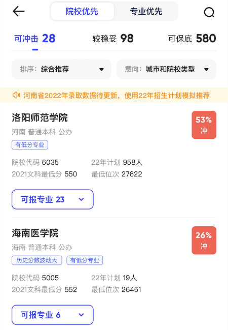 输入所在地区、分数及文理科后,软件首页立即出现了一个针对个人的曲线值。以河南520分的文科考生为例,此分数已超过本省考生的百分比、推荐可冲击的院校、较为稳妥的院校以及保底院校清晰可见,如果你想要的功能仅是如此,那么恭喜你,这些软件一定能为你节省不少时间。