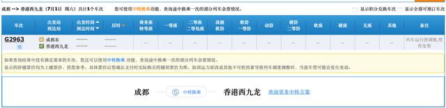 目前,成都东至香港西九龙方向的列车车票仍未开售,但已可通过12306查询到该趟车次。