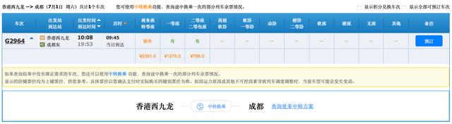 6月17日,红星新闻记者通过12306查询看到,7月1日,香港西九龙至成都东的高铁车票正式开售,跟此前公布的消息相同,二等座票价796元,全程用时9小时45分钟,列车于晚上19时53分抵达成都。