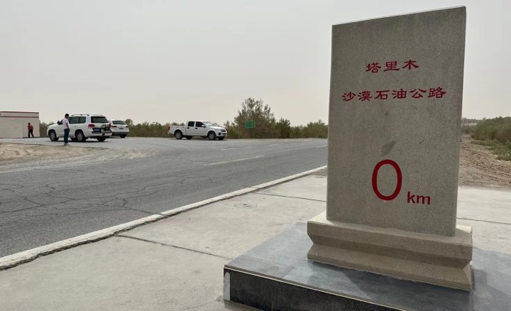 从距轮台县县城沿沙漠公路开车两个多小时,一块水泥堆砌的路牌墩提醒,“塔里木沙漠石油公路0km”,这里是沙漠路段的起点。