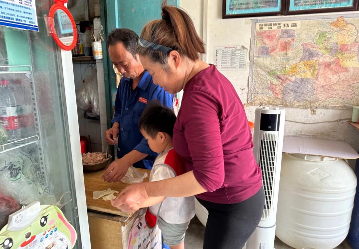每个水井房有三个房间,一个卧室,两个工作间。这间不大的卧室里,放着两张床、两个冰柜和三大桶生活用水。一张小桌子上,肖洪正在教2岁的孙女包馄饨。