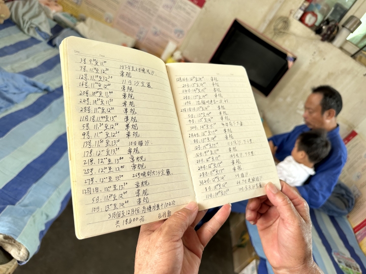 工作日记上,夫妻俩记录者滴灌、施肥、材料更换等每天日常。比如滴灌启动时间、轮灌区范围和累积用水量;3月份累计更换毛管接头21个等等。