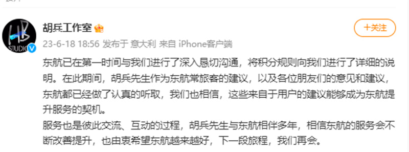 18日晚,胡兵工作室微博回应表示,东航已在第一时间与胡兵方详细说明了积分规则。回应中称,胡兵作为东航常旅客的建议,以及各位朋友们的意见和建议,东航都已经做了认真的听取,并称希望东航越来越好。东航官方微博也转发该则回应称:精彩的旅程,离不开每一位旅客的理解与支持,我们会专注倾听,持续提升,让每一段旅途更加美好。