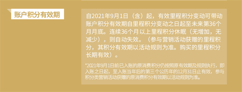 现代快报记者查询东航官网了解到,根据“东方万里行”会员手册中账户积分有效期的相关规定,自2021年9月1日(含)起,有效里程积分变动可带动账户积分有效期自里程积分变动之日起至未来第36个月月底。连续36个月以上里程积分休眠(无增加,无减少),则自动失效。2021年9月1日前已入账的原消费积分仍按照原有效期及规则执行,即入账之日起,至入账当年后的第三个公历年的12月31日止有效。